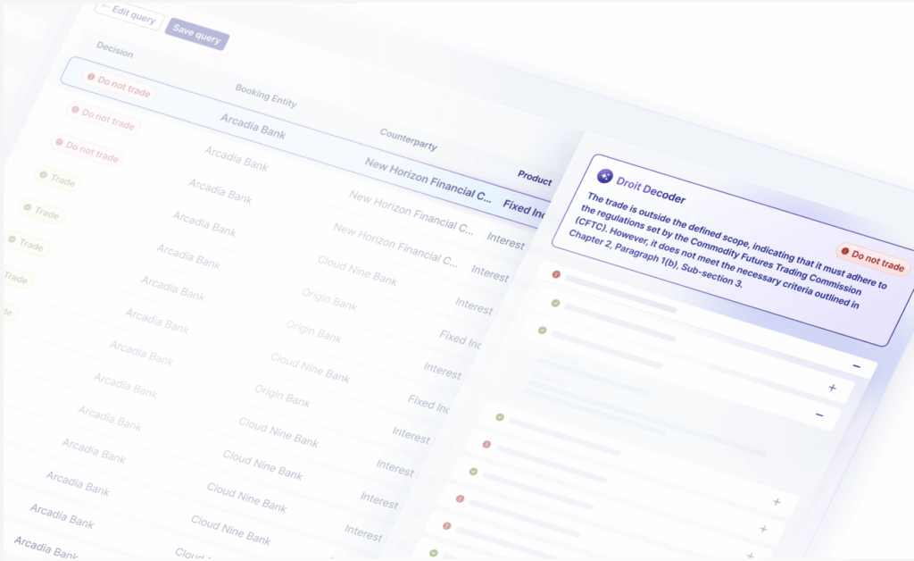 Droit’s Decision Decoder makes accessing the platform’s unparalleled precision and transparency even easier by providing context-aware explanations of the decision-making outcomes.The click-to-expand overviews of regulatory decision outputs, backed by Droit’s Logic Viewer and Digital Library, increase the speed to full understanding by leveraging AI.